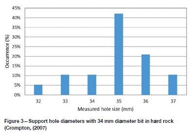 South African hard rock mines commonly use 34 mm diameter drill bits with pneumatic rock drills when drilling support holes. Measurement of 37 holes found that the drilled hole diameters varied from 32 mm to 37 mm (see Figure 3; Crompton, 2007). Although the average support hole diameter measured was 35 mm, 30% of the measurements exceeded 36 mm. Factors such as age and wear of the drill bit, adherence to discard criteria, condition of the rock drill, and the quality of the compressed air supply all impact on the hole diameter.