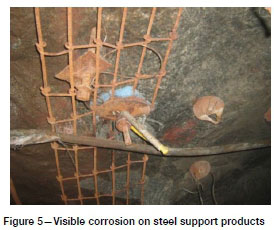 Corrosion of steel rockbolts can be problematic given the potential long-term exposure to corrosive conditions in some installations (Aziz et al., 2013). This is particularly noticeable in certain shafts where accelerated corrosion is evident on all steel products in use (see Figure 5).