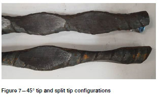 Centralization of a resin bolt in a support hole encourages consistent mixing of resin during installation, the even distribution of stress from the tendon into the resin annulus under tensile loading, and maximizes the corrosion protection ability of the resin by fully encapsulating the tendon. In order to assess the centralization of available bolt designs, 20 mm diameter paddled bolts were manufactured with 45° cropped tips and also with split tips (Figure 7), and installed into steel pipes internally threaded with a resin annulus of 9 mm.