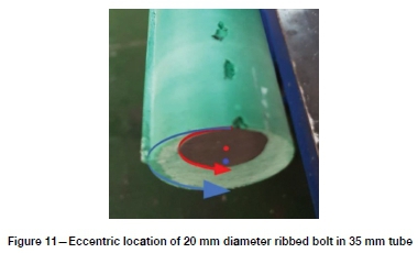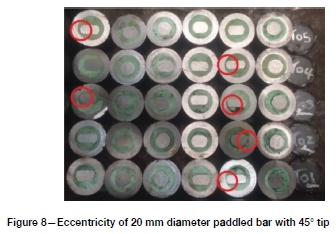 Once the resin had cured sufficiently, samples were sliced at 50 mm intervals along their length so that the cross-section of the rockbolt and resin could be investigated. This helped determine the degree of eccentricity for both tip designs. The tests found that neither the 45° cropped tip nor the split design ensured centralization of the rockbolts during installation.
