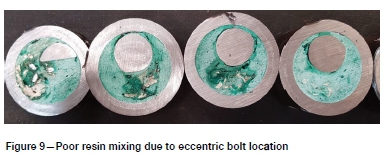 Centralization of the rockbolt during the mixing of the resin capsule was found to be key to improving the quality of resin mixing. Non-centred rockbolts were more prone to gloving and poor mixing due to the eccentric rotation in the support hole. Rockbolts with paddle-type tendons were found to result in the best quality resin mix (once centralized). However, deformations in a rockbolt's cross-section create voids in the resin as the mixed resin is unable to flow in behind the paddles during rotation of the bar. These voids reduce the load-bearing capacity of the installed rockbolt and expose the steel to water and corrosive constituents in the host rock.