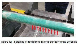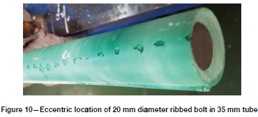 After installation, the samples were removed from the tubes (Figure 10) so that the installed resin bolts could be assessed for centralization, quality of mixing, gloving, and voids. Immediately noticeable were the eccentric location of each sample and a line of voids along the resin/interface on the side where the tendon contacted the tube wall. These voids resulted in an inconsistent coating of the rockbolt by the resin, with the steel being exposed in several places along the length of the sample.