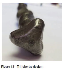 Sample tendons were manufactured with a 32 mm tri-lobe tip on the distal end of the tendon (Figure 13). The design is intended to optimize centralization of a resin bolt in boreholes with a diameter range of 32 mm to 38 mm. Samples were again installed into simulated boreholes with an internal diameter of 38 mm and then sliced into segments for analysis.