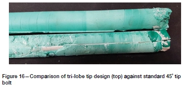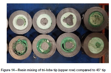 Figure 16 illustrates this with a side-by-side comparison of two identical tendons, with the top tendon having a tri-lobe tip and the bottom tendon a 45° tip. The tendon with the tri-lobe tip has well mixed resin along the entire length of the resin bolt with the capsule packaging wrapped up at the distal end of the bolt. Conversely, the bottom tendon with the 45° tip has poorly mixed resin along its length, unmixed catalyst visible, with gloving visible and unmixed resin at the distal end of the bolt.