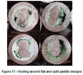 To assess the efficiency with which different tendon geometries mix resin, split paddle and flat paddle designs were tested. As anticipated, both designs improve the mixing of the resin; however, both exhibited voiding around the paddled sections of the tendons (Figure 17). These voids result from curing resin being unable to flow and fill in around the rotating paddles faces during mixing. Although acceptable load capacity was still achieved when pull-testing these samples, the presence of voids may compromise the corrosion protection of the resin bolt.
