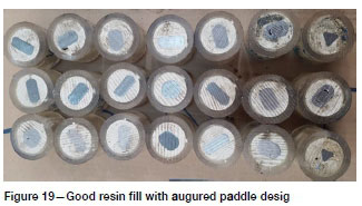 To overcome the problem of voids arising from pure rotation of the resin during mixing, a design was then tested with the paddles on the bolt twisted on the bolt axis. During mixing the rotating paddles act like an auger (Figure 18), pumping the resin towards the distal end of the borehole and preventing the formation of voids behind the rotating paddles, as can be seen in Figure 19.