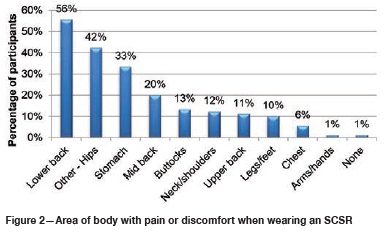 The majority of the participants reported discomfort while wearing SCSRs on the belt during their daily work, with 68% reporting that this occurred most or all the time (Figure 1). The body areas where the most discomfort was experienced were the lower back, hips, and stomach (abdomen) (Figure 2). Participants commented that they hoped the SCSRs could be made smaller, lighter, and more comfortable.