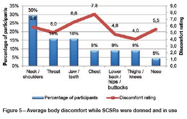 The ergonomic design for donning of the SCSRs was, on average, rated as acceptable. However, some of the participants experienced difficulty in opening the protective casings of the SCSRs, and with locating and adjusting the straps. When the SCSRs were donned and in use, the lowest score was for the comfort of the nose-clips (which are to prevent breathing in of toxic gases) as these were often noted as causing pain.