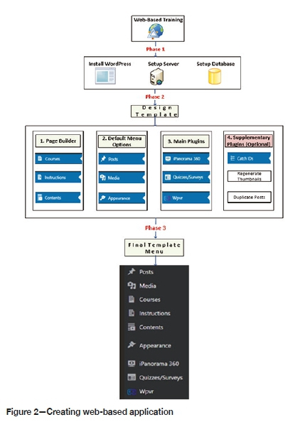 There were three major phases in building the web-based training application that would create and present training courses for heavy machine operators. Figure 2 shows the steps in creating the application with WordPress.