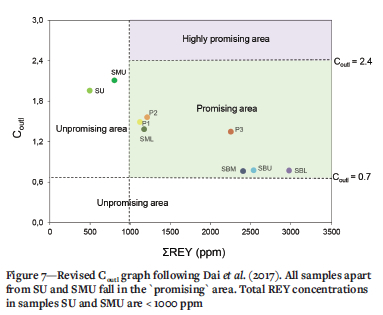 The Coutl value for the Makhado fine-size samples vary from 0.8 to 2.0 and thus indicate promising REY sources (Table VII). The ZREY for the lower seams as well as P2, SML and P3 exceeds 2000 ppm and therefore meets the cut-off grade (Figure 7). In contrast, samples SU and SMU do not qualify as promising REY sources due to their ZREY concentrations being less than the required 1000 ppm cut-off grade. South African coal ash samples obtained from power stations in the MKB were similarly disregarded as potential sources of REY due to their ZREY content falling below 1000 ppm, despite meeting the Coutl criteria (Wagner and Matiane, 2018).