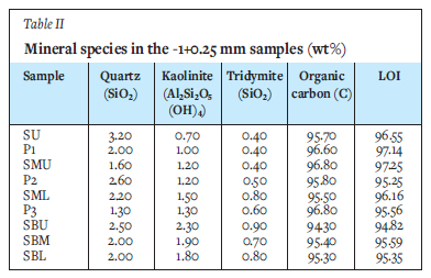 The mineral content determined by XRD (Table II) is low, predominantly consisting of quartz (1.30-3.20%) and kaolinite (0.70-2.30%). Minor tridymite (< 0.90%), a high-temperature polymorph of quartz, was also detected in the samples, possibly due to elevated temperature during XRD analysis. Additional minerals such as pyrite and siderite were below the detection limit of 0.5-3 wt%. The XRD and XRF data are in agreement as the measured high silica (SiO2) and aluminium (Al2O3) correspond to the dominance of quartz and kaolinite reported in the samples.
