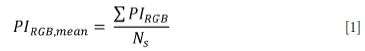 The method of calculating the reflectance for each mirror is described by Griffith, Vhengani, and Maliage, (2014). First, a dark image is taken to subtract from the illuminated image, cancelling out the camera sensor and background noise. Red-green-blue (RGB) mean channel pixel intensities (PIs) are then calculated for the corrected image, yielding PIrgb. These two steps are repeated for a minimum of ten sampling spots, Ns, per mirror. The mirror mean is then calculated by