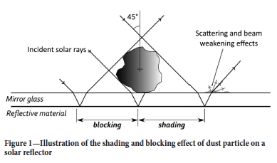 An area of CS and PV research that has been receiving increased attention is soiling of solar panels and reflectors (Costa, Diniz, and Kazmerski, 2016, 2018; Kazmerski, Diniz, and Costa, 2020). The performance of a PV cell is inversely proportional to the amount of dust shading the cell, whereas the performance loss for CS systems can be up to 14 times greater because the solar radiation has to pass twice through the soiled layer (Bellmann et al., 2020). The schematic in Figure 1 illustrates the problem.