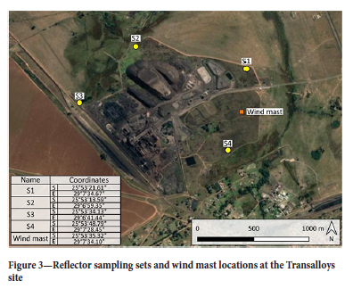 The investigation was conducted at Transalloys, a ferromanganese smelter in Emalahleni, Mpumalanga, South Africa. The plant is one of two ferromanganese producers in South Africa, with an annual production of around 165 000 t. The smelter is located in the industrial heart of South Africa (Figure 2), with numerous coal-fired power plants, coal mines, cement quarries, and ferrochrome smelters in the vicinity. These factors make Transalloys an ideal location at which to to investigate aspects of solar reflector soiling.