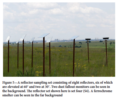 To establish whether the smelter is indeed the main dust source, both the total atmospheric dust and the dust soiling the reflectors were characterized. The deposited atmospheric dust (dustfall particles) was sampled after the extended March to May 2020 sampling period. The reflector soiling dust was sampled after the reflectance measurement campaign.