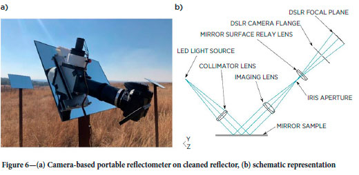 Field soiling studies of solar reflectors are conducted using portable reflectometers, such as the ones compared by Fernández-García et al. (2017). Guidelines developed by a SolarPACES (Solar Power and Chemical Energy Systems) working group on reflectance measurement (Meyen et al., 2018) were adhered to as far as is possible.