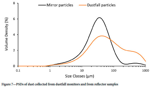 The PSD curves indicate that the dust present in the atmosphere has a much wider size range than the dust found on the reflectors. It was observed that particles larger than 100 μm tend to fall off the mirror, and for the most part are transported only a limited distance from the dust source, as shown by the count peak of the atmospheric dust PSD being below 100 μm. The mean dust particle size found on the reflectors was 35.5 μm, with 50% of the sample being less than 31.1 μm, and 90% smaller than 98 μm.