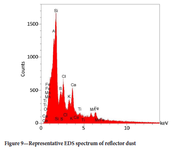 Quantitative analysis was conducted using a Thermo Noran energy dispersive spectroscopy (EDS) instrument. A representative spectrum of the reflector dust is shown in Figure 9.
