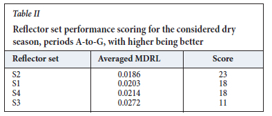 The performance of the different reflector sets during the dry season is simmarized in Table II. The averaged MDRLs are listed alongside a simple scoring system, with one point assigned to the set with the highest MDRL during a particular period and four points to the lowest MDRL.
