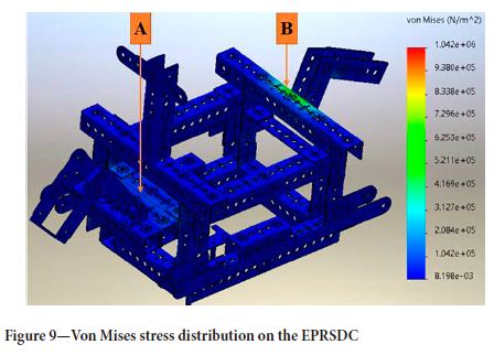 across the entire chassis of the crawler. Notably, the areas exhibiting the highest stress concentration, denoted as A (pressure pump base) and B (boom arm base), manifest stress values in the range of approximately 4.2 x 105 N/m2 and 7.2 x 105 N/m2, respectively. These points are highlighted in green on the von Mises stress data table. It is noteworthy that this stress region remains below the yield stress threshold of 1050 aircraft-grade aluminium. Consequently, the material demonstrates commendable performance under the applied loading conditions, characterized by a low risk of failure. This analysis further underscores that the majority of components fall within the safe range, exhibiting stress values ranging from 8.1 x 103 N/m2 to 2.08 x 105 N/m2.
