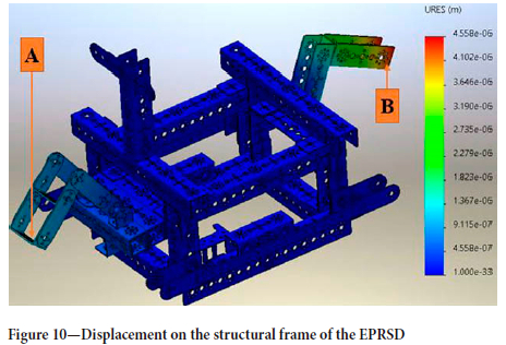 As depicted in Figure 10, the points exhibiting the maximum displacement are on the boom arm (A) and pump mount base (B). This displacement is attributed to the moment of force acting on the component, which surpasses the longer perpendicular distance between the base point and the endpoints of the arm and pump mount. An increase in the distance between points A and B will result in an increase in the maximum displacement of the structural frame. We therefore propose locating the pump mount arm on the beam, with the arm being reinforced by channels from beneath the base. The point of maximum displacement registers within the red zone, measuring 4.5 x 10-6 m (0.0000455 mm). This result is deemed acceptable, as the displacement magnitude is exceedingly minute and exerts negligible influence on the crawler's performance.