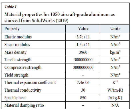 Table I presents the material properties of 1050 aircraft-grade aluminum, sourced from SolidWorks (2019).