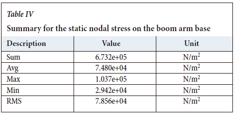 Figure 15 presents an analysis of nine selected points on the boom arm base, which bears the weight of the entire arm. The combined weight of the base and arm was quantified as 2.808 N. Von Mises stress distribution was then plotted across the cross-sectional area of the 160 mm channel beam. The analysis revealed notable stress points, initiating at a minimum of 3.7 x 104 N/m2 at node #193995. The stress levels underwent a rapid escalation, culminating in a maximum stress of 1.0 x 104 N/m2. There was a slight reduction in stress on the beam from 7.9 x 104 N/m2 to 7.8 x 104 N/m2.