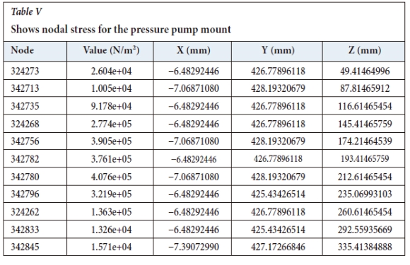 It initially increased to 2.6 x 104 N/m2, subsequently dropping to its lowest point at 1.0 x 104 N/m2 at node #324273. The stress then exhibited a progressive surge, reaching 9.1 x 104N/m2, which further escalated to 2.77 x 105 N/m2. A subsequent peak stress of 3.9 x 105 N/m2 was reached, followed by a slight decrease to 3.7 x 105 N/m2 at node #342782. The stress subsequently peaked at its highest value of 4.0 x 105 N/m2 at node #342780. From there, it began to gradually decline, reaching its ultimate minimum at 1.5 x 105 N/m2. The graph also underscores two critical points of maximum stress located at the middle of the 288 mm channel, denoted as the maximum stress points of 3.9 x 105 N/m2 and 4.0 x 105 N/m2, corresponding to the base mount on which the pump is affixed.