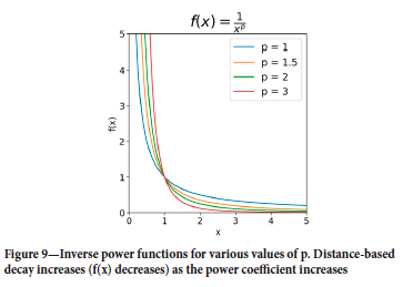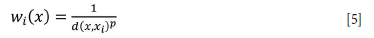 where d is the distance between a known-value location xi and the location to be interpolated, x, and p is the power coefficient describing the rate of decay.