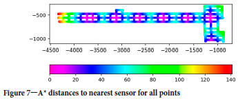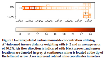Spatial interpolation across the underground mine is achieved by inverse distance weighting, which uses the distance from a set of known values to a target (i.e., the output of the A* algorithm) (Shepard, 1968). Inverse distance weighting is predicated on the assumption that values from a known point generally decay with increasing distance from that point. This decay can be generalized as: