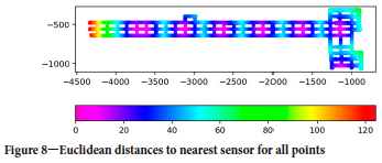 While the visual difference between the two distance metrics is small, the use of A* distances in interpolation with NeaRTIMe provides a meaningful reduction in estimation error. By better accounting for the mine's geometry, spatial relationships between locations within the mine's ventilation system are more realistically preserved than is possible with a Euclidean distance, which may draw its lines through rock or stoppings. This effect is slightly more visible when displaying the minimum distances to sensors within the mine (Figures 7 and 8). The A* distances tend to have curving, subcircular contours, whereas the Euclidean distances tend to preserve horizontal and vertical contours more, due to the orientation of the excavation and placement of sensors.