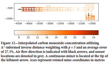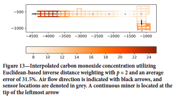 Further work is warranted in the modelling of air quality in underground mines. Most notably, steps should be taken to reduce the estimated error in these models. Likewise, the inclusion of other validation metrics like RMSE and MSE will provide valuable insights into interpolation performance. Inverse distance weighting, by nature, cannot identify minima and maxima that lie outside of the input data. This means that all modelled values within the interpolation are constrained between the minimum and maximum values reported by sensors. In its current state, NeaRTIMe is limited by its interpolation method. With the use of stochastic methods such as ordinary kriging and cokriging, rather than deterministic methods like nearest-neighbour and inverse distance weighting, NeaRTIMe would permit the inclusion of exogenous factors like air velocity, humidity, and temperature (Pan et al., 1993). The combination of these variables in an interpolation model would most likely have a significant impact on estimation error while also returning a distribution of the estimate rather than a point estimate.Ordinary kriging has shown promise for the real-time monitoring of underground gas distributions, with the added benefit of improved quantification of uncertainty for each estimate rather than the estimated distribution as a whole. Work is ongoing to develop a pathfinding algorithm that will account for the flow of air within the mine, which should improve the quality of estimates with NeaRTIMe. The addition of other exogeneous factors will be vital to improved monitoring because of their impact on the fate and transport behaviours of airborne contaminants. Additionally, further work is required to reduce the total delay from data collection to visualization. Methods for error and delay reduction would also provide opportunities for the analysis of fate and transport mechanisms within the mine, allowing AMS operators and ventilation-on-demand systems to detect and mitigate potentially harmful conditions.