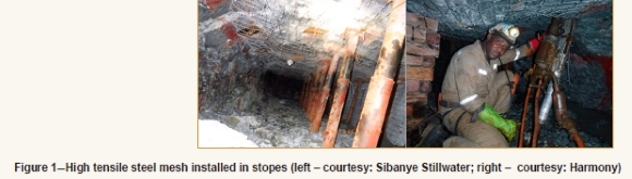 I was particularly impressed by the adoption of permanent mesh support in narrow tabular stopes. This innovation involves securing high tensile steel mesh to the hanging wall using an array of supports including rockbolts, timber props, timber packs, and mechanical props (Figure 1). While rockburst resistant supports, such as rapid yielding hydraulic props and engineered timber props, have been employed for many years, they have not entirely mitigated the risk of fatal injuries during rockbursts, as the rock tends to fail between these supports. Integrating the high tensile mesh into the support system could significantly reduce the risk of injuries and fatalities.