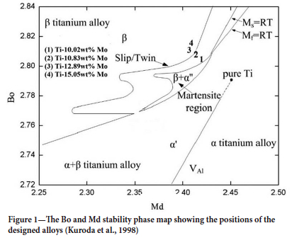 The phase stability map was used to predict the stability of the ß phase in Ti-Mo alloys upon quenching from the beta transus. According to the phase stability map, Ti-10.02Mo is located between the martensitic and the ω phase boundary lines, indicating that it will form ß+α"+ω upon quenching above the beta transus. Ti-10.83Mo is between the slip line and the co boundary line, meaning that after quenching the alloy will include ß+ω. The Ti-12.89Mo alloy is situated in the ß field, suggesting that the alloy will contain ß phase only. The Ti-15.05Mo alloy is positioned in the ß field, implying that it will comprise only ß phase upon quenching from above the beta transus region. The calculated Mo equivalences, e/a ratios, bond order (Bo) and mean d-orbital energy level (Md) values are presented in Table I, while their positions are indicated on the Bo and Md stability map in Figure 1.