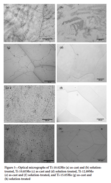 Figure 3 depicts the optical micrographs of the alloys in the as-cast and solution-treated conditions. Ti-10.02Mo consists of equiaxed ß grains and sub-grain boundaries in both the as-cast and solutiontreated conditions (Figure 3a and 3b). The Ti-10.83Mo alloy contains ß equiaxed grains with fewer sub-grain boundaries than Ti-10.02Mo in the as-cast condition. After solution treatment, the alloy consists of ß equiaxed grains only. As-cast Ti-12.89Mo has a similar structure to Ti-10.83Mo, although with a lower volume fraction of sub-grain boundaries. The solution-treated microstructure is similar to Ti-10.83Mo. The Ti-15.05Mo alloy in the as-cast condition is comparable to Ti-10.83Mo and Ti-12.89Mo alloys, with a significant decrease in the sub-grain boundaries. The solution-treated micrographs show only ß equiaxed grains.
