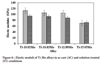 The elastic moduli of the alloys are illustrated in Figure 8. The Ti-10.02Mo alloy in the as-cast condition exhibited the highest elastic modulus, and after solution treatment the elastic modulus decreased significantly. The high elastic modulus in the as-cast alloy may be attributed to the presence of co precipitates as observed in the EBSD map (Figure 4b). The elastic moduli of as-cast Ti-10.83Mo and Ti-12.89Mo were found to be higher than the values after solution treatment. This may be due to the higher volume fraction of the c phase, although c was not detected, due to segregation during cooling. The decrease in the elastic modulus as the Mo content increased is due to the stability of the ß phase and the suppression of the orthorhombic martensitic α"phase, which is evident in the XRD spectra and optical micrographs. The elastic modulus of Ti-15.05Mo increases after solution treatment. This may be attributed to the substantial increase in the volume fraction of co precipitates, as seen in the EBSD phase map in Figure 7d. Lee and Ju (2002) reported that the phases influence the elastic modulus in the order Eω > Eα' > Eα" > Eß. It is noted that the co phase has a higher elastic modulus than the ß and martensitic α"phases. Likewise, it is well known that the ω phase has a significant effect on the mechanical properties of Ti alloys, and it is likely to increase the elastic modulus (Akahori, Niinomi, and Fukui, 2005). Graft, Levinson, and Rostoker (1957) also indicated that the co phase had an unusually high elastic modulus. Hao et al. (2006) also reported that the co phase is deleterious to the mechanical properties as it increases the elastic modulus.