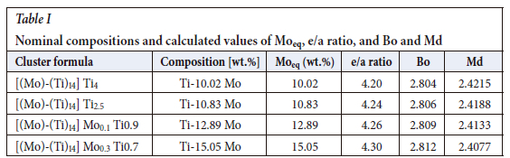 The cluster-plus-glue-atom-model was used to design the compositions of the Ti-Mo binary alloys. The ß-stabilizing prediction tools found in the literature, such as molybdenum equivalence (Moeq), valence electron to atom (e/a) ratio, and the d-electron stability map were used to forecast the stability of the ß phase. Moeq is defined as the total number of beta-stabilizing elements, alpha-stabilizing elements, and neutral elements required to retain 100% of the ß phase after quenching from above the ß transus temperature to room temperature (Welsch, Boyse, and Collings, 1993). Bania (1994) reported that a Moeq value of 10.0 wt% in Ti-Mo alloys is required to stabilize the ß phase during quenching. The e/a ratio is the average number of valence electron in each atom of Ti-Mo binary alloys and is used to predict the formation of athermal omega (ω) phase in Ti alloys. According to Ikehata et al. (2004) the formation of athermal omega phase is at its maximum at an e/a ratio of 4.13 and minimum at 4.30; above this minimum the ß phase becomes dominant. The calculated values of Moeq and e/a showed that all the designed alloys will stabilize the ß phase upon quenching without precipitation of the ω phase.