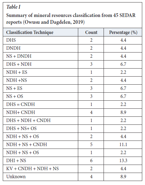After critical analysis of the classification guidelines used by the various companies, it was established that 43 of the reports applied geometric methods and two combined geostatistical and geometric methods. These included techniques such as drill-hole spacing (DHS), distance to nearest drill-hole (DNDH), number of samples (NS), number of drill-holes (NDH), ellipsoidal search (ES), octant search (OS), drill-hole intercept (DHI), and kriging variance (KV). In most cases, some of the CPs combined multiple techniques like NS and NDH (NS + NDH), DHS and NDH (DHS + NDH), NS and ES (NS + Es). Table I and Figure 2 represent the various classification techniques applied for gold deposits used in the research. In the pie chart, the percentages are rounded to their whole numbers. After evaluating the different reports, it was found that there is currently a lack of uniformity in resource classification reports due to the different assumptions made by individual CPs. Also, it was found that industry players prefer the the geometric method due to its time-saving and simplistic characteristics. Hence, there is a need to develop easier and quicker techniques for the geostatistical method to enhance its use in the resource classification process.
