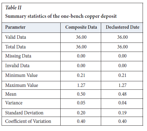 The distribution of copper in the deposit was analysed using statistical and geostatistical techniques. Table II and Figure 3 show the summary statistics and the histograms of the original composite data and the declustered data respectively. All copper grade units are given as percentages (%Cu). Variogram modelling was generated from the data to determine the spatial continuity of the data points.
