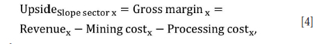 U and D can be based on any measure of consequence, such as NPV, mining contribution, tonnes mined, gross margin, or carbon emissions, to name a few, provided U and D use the same units of measure. The mining surplus for a pit shell is selected for this paper, given by Equation [4], as it allows a simple isolation of the geotechnical decision while still factoring in the full mining cost. Revenue is the ore units χ ore unit price for a given slope sector in a pit shell and the mining cost is the total mining cost for that slope sector. The advantage of using the gross margin as defined here, as opposed to the NPV, is that it allows the slope angle decision to be decoupled from extraction schedules and cash-flow models, while still factoring in processing cost. Where schedule options are considered important, the present value of the gross margin can be used.