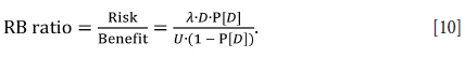 For a slope scenario where the benefit is greater than the risk, the RB ratio will be less than 1; where the risk is equal to the benefit, the RB ratio will equal 1; and where the risk is greater than the benefit, the RB ratio will be greater than 1. The RB ratio can be minimized by changing the P[D] and its associated U and D values until the minimum RB ratio is achieved. The minimized RB ratio will give the same value for P[D] as simply maximizing the risk-adjusted value.