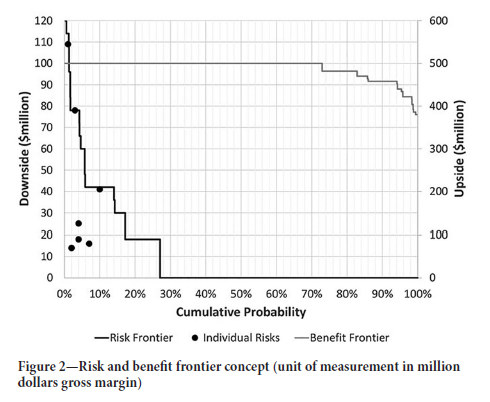 Contreras (2015) did, however, not make allowance for a benefit frontier, which is required for the MRM. The benefit frontier for each slope sector and pit shell can be calculated from the risk frontier using Equation [2], with U determined by applying Equation [4]. The risk frontier then represents the cumulative probability diagram of D, and the benefit frontier the cumulative probability diagram of U.