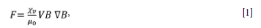 where Xv is the dimensionless volumetric magnetic susceptibility of a particle, V is the volume of particle, μ0 is the magnetic susceptibility of vacuum, B is the external magnetic induction, and VB is magnetic field gradient of the magnetic induction (Asai, 1989, 2012; Davidson, 1999; Fautrelle et al., 2009; Jiles, 2015).