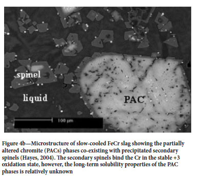 Ferrochromium alloys are indispensable ingredients in the production of various grades of stainless steel alloys. They are produced from the carbothermic reduction of beneficiated chromite concentrates in submerged arc (SAF) or direct current (DC) arc furnaces. About 6 Mt of FeCr slags are produced globally, corresponding to about 1.1-1.6 tonnes of slag per tonne of FeCr alloy (Niemelä and Kauppi, 2007). Depending on the type of raw materials and process control philosophy, FeCr slags naturally contain elevated amounts of residual Cr, often in the range 1.8-8.7 mass% Cr2O3 (Harman and Rao, 2013; Hayes, 2004; Matinde and Steenkamp, 2021; Niemelâ and Kauppi, 2007). The Cr in solidified FeCr slags can also occur as partially altered chromites (PAC), chromites (Cr2O3) dissolved in slag, Cr alloy phases dispersed in slag (Holappa and Xiao, 2004; Panda et al., 2013), as well as Cr bound in (Mg,Fe)/(Fe, Al, Cr)2O4 or FeCr2O4 spinel phases (Li et al., 2013; Samada et al., 2011). Tanskanen and Makonnen (2007) confirmed that the phases in air-cooled industrial FeCr slags consist of partly crystalline and hypidiomorphic spinel ((Mg,Fe)/(Fe,Al,Cr)2O4), forsterite (Mg2SiO4), and pyroxene (Mg2(Cr,Al,Si)2O6) crystals enclosed in a condensed and homogenous glass matrix (Figure 4a). Hayes (2004) investigated the microstructure of slow cooled FeCr slags and identified the presence of PAC phases co-existing with precipitated secondary spinels (Figure 4b). The phase composition of FeCr slags is strongly dependent on the chemical composition and cooling characteristics and/or their olidification pattern of the slags, understanding their crystallization and solidification behaviour therefore provides an entry point to understanding the speciation and recoverability of Cr from industrial FeCr slags (Harman and Rao, 2013; Hayes, 2004; Li et al., 2013; Matinde et al., 2018; Niemelâ and Kauppi, 2007; Samada et al., 2011; Tanskanen and Makkonen, 2007).