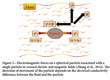 The application of magnetic fields, commonly referred to as magnetohydrodynamic (MHD) processing in process and engineering metallurgy, is not new. Various forms of MHD principles have been widely adopted in the processing of conducting metallic melts, particularly in areas such as electro slag re-melting, homogenization of alloys, inclusion removal, and controlled solidification of metallic melts and alloys (Asai, 2012; Davidson, 1999; Fautrelle et al., 2009; Leenov and Kolin, 1954; Takahashi and Taniguchi, 2003; Zhang et al., 2014). Magnetohydrodynamic studies focus on the magnetic properties and behaviour of electrically conducting fluids such as plasmas, liquid metals, sea water, and electrolytes (Asai, 2012; Davidson, 1999; Fautrelle et al., 2009; Leenov and Kolin, 1954). Magnetohydrodynamic processing exploits the different behaviours of electrically conducting particles in an electromagnetic field, with different materials exhibiting different behaviours under static or transient magnetic fields. The MHD behaviour of electrically conducting fluids is governed by a combination of Maxwell's equations, Ohm's law and Navier-Stokes equations on fluid flow in electric and magnetic fields. The fluid driving force is induced by imposing a direct electric current and a magnetic field, F = J x B or by imposing a travelling magnetic field (Asai, 2012; Davidson, 1999; Fautrelle et al., 2009; Leenov and Kolin, 1954; Scepanskis and Jakovics, 2016; Takahashi and Taniguchi, 2003; Zhang et al., 2014). In this case, J and B denote current density and magnetic flux, respectively.