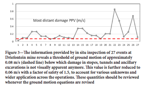 Ferreira et al. (2023b) reported on the extent of damage produced by 27 events from one of Driefontein's deeper shafts, spread over a period of 20 months (demonstrated in Figure 3). The occurrences ranged in magnitude from ML0.9 to ML3.4. The information was recognised as being limited, but established the distances from event sources to the point where no more damage is apparent to an observer during subsequent in situ investigation. The corresponding PPV was then calculated at those distances.