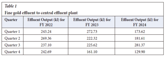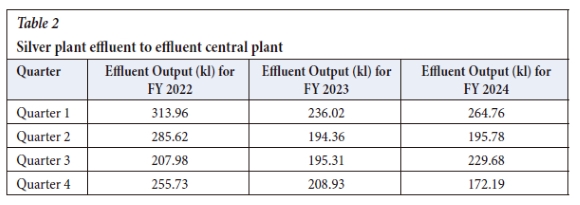 For context, Tables 1 and 2 provide a summary of the effluent data for both the gold and silver effluent streams. The effluent output data for the fiscal years 2022 to 2024 show a general trend of reduction, with some fluctuations. In FY 2022, the effluent output was relatively high across all quarters. In FY 2023, there was a noticeable reduction, particularly in Quarter 4 (161.10 kl), which coincides with the start of the granulation recycling work on 29 July 2023. This trend continued into FY 2024, with significant reductions in Quarter 1 (173.62 kl), Quarter 2 (181.61 kl), and Quarter 4 (129.90 kl). However, there was an increase observed in Quarter 3 of FY 2024 (281.37 kl), indicating some variability in the effluent output over the years, which was caused a floor repairs project conducted on the granulation water recycle circuit area.