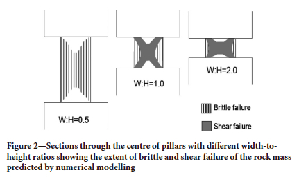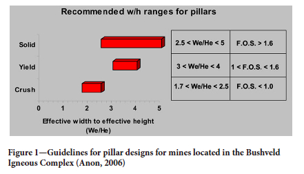 In the case of crush pillars, a factor of safety (FOS) of less than 1 is recommended as the pillars are designed to crush in a stable manner. Width-to-height ratios of crush pillars employed in the South African gold and platinum mines generally vary between ~1.3 to ~2.5. The schematic shown in Figure 1, highlights guidelines for pillar designs for mines located in the Bushveld Igneous Complex (Anon, 2006).