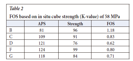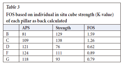 The FOS for the pillars based on the APS and H-G formula using: (i) a minimum of 58 and (ii) the individual back-calculated K-values, is shown in Table 2 and Table 3 respectively.