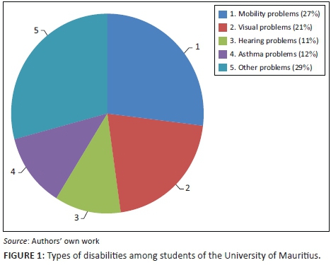 Figure 1 represents an overview of the students with disabilities in this study. For the 2015-2016 academic years, there were 52 students (0.4% of the student population) who declared that they have some form of disability or an other. About 27% of these 52 students have mobility problems (hand, leg or other parts of the body), about 21% have visual problems, 11% have hearing problems, another 12% have asthma problems and the rest have other medical problems such as diabetes, stammering, difficulty to concentrate and other rare or complex conditions. This information was received from the University of Mauritius.